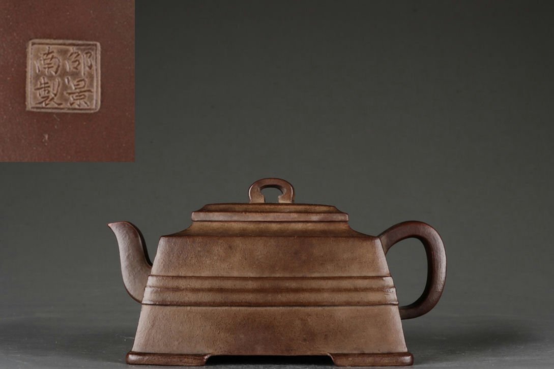 > ▼渡鶴羽▼A0825時代朱泥 四方腰線紫砂壺 在銘 邵景南 清時代 在銘 /紫砂 煎茶道具 朱泥 茶壺