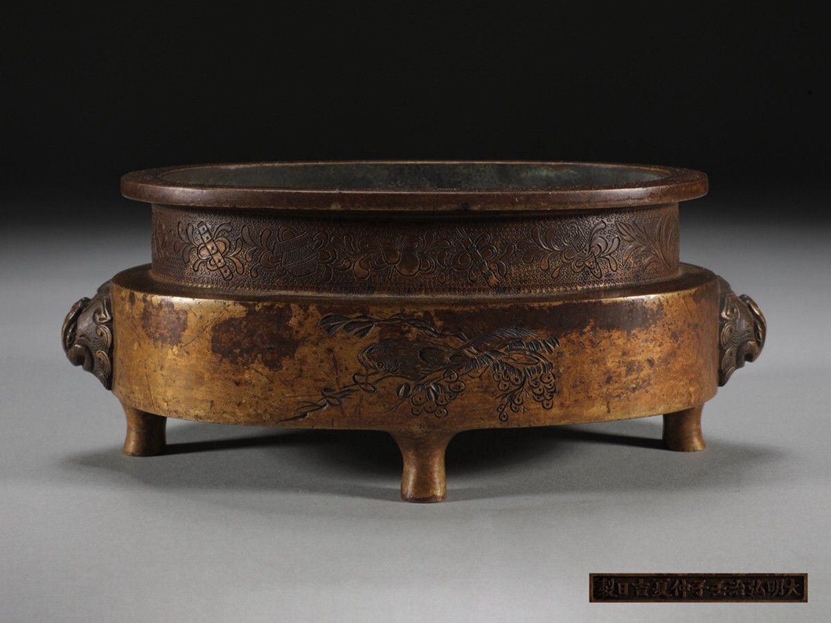 - 「明代 大明弘治壬子仲夏吉日製 古銅彫 天鶏耳 鬲式老銅香炉」旧銅器 置物擺件 賞物 中国古美術 旧蔵出