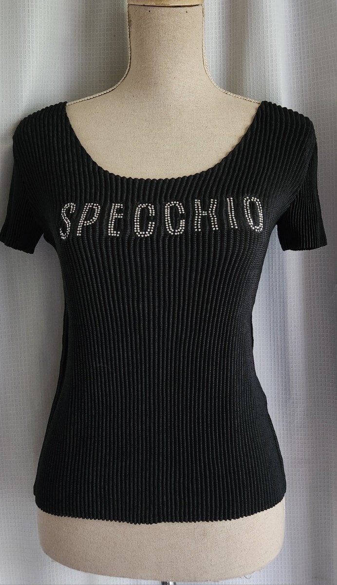 - 大変美品 SPECCHIO ビジューロゴ入りプリーツ加工ブラウス ブラック 半袖