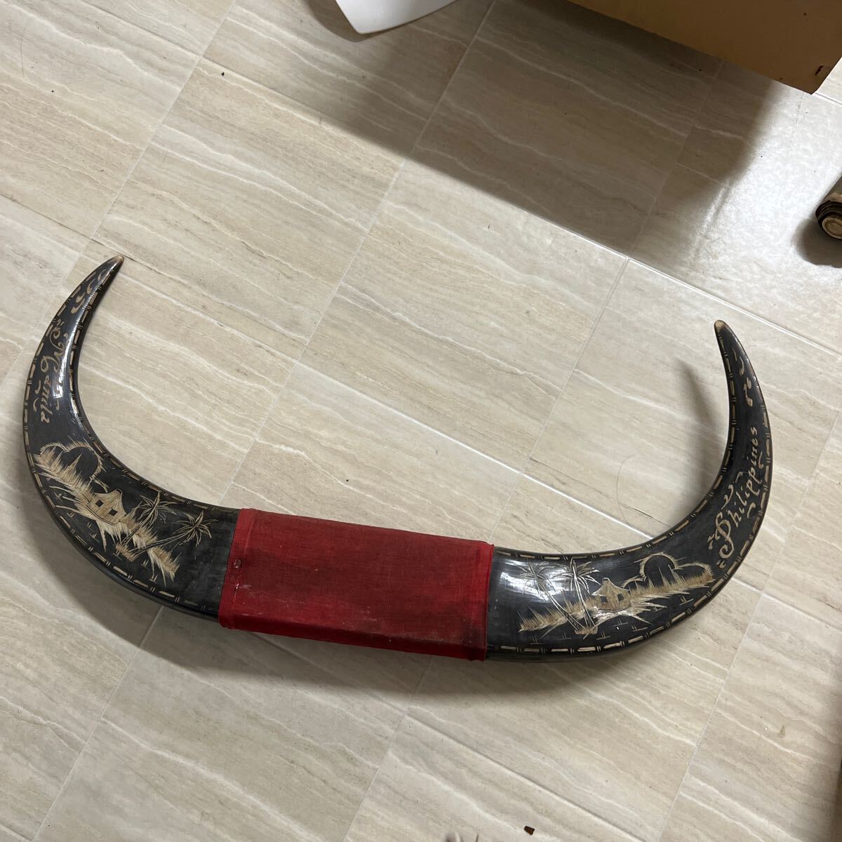 - △メ右△ 置物 インテリア 水牛の角 オブジェ 縁起物 飾り物 アンティーク フィリピン Philippine