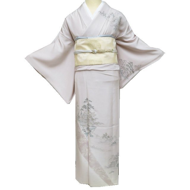 > 訪問着 着物 中古 正絹 単衣 フォーマル 自然文様 風景 家屋 灰白色 多色 金 身丈162cm 裄63cm M きもの北條 A1212-19