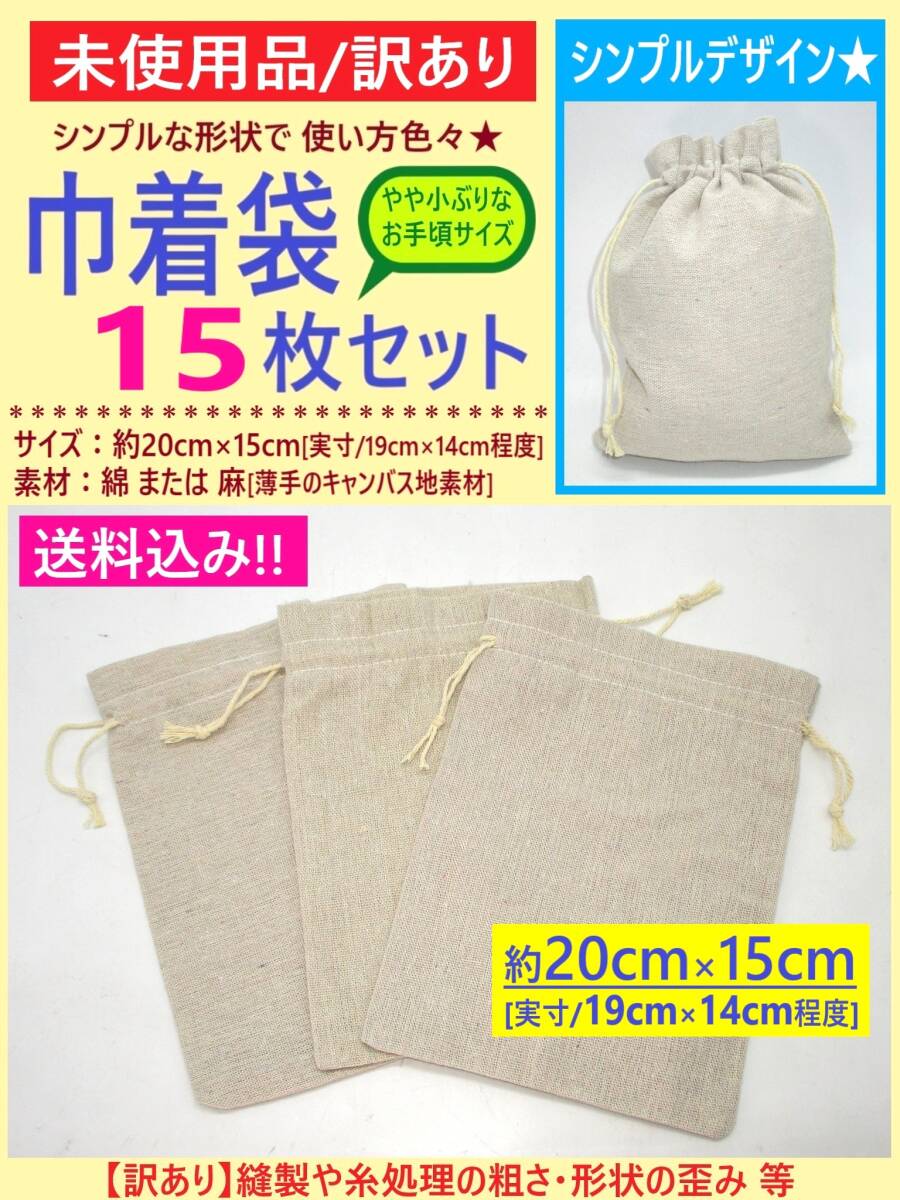 - 訳あり 未使用 無地 キャンバス地 巾着 袋 15枚セット B 20×15 綿 または 麻 布 バッグ 薄手 小分け 収納 ラッピング 材料 ミニ 海外製