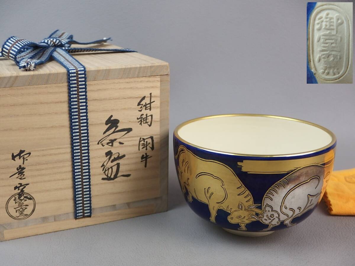 - 【骨董・茶道具】★平安御室窯★★紺釉闘牛茶碗 gl083tb42.7