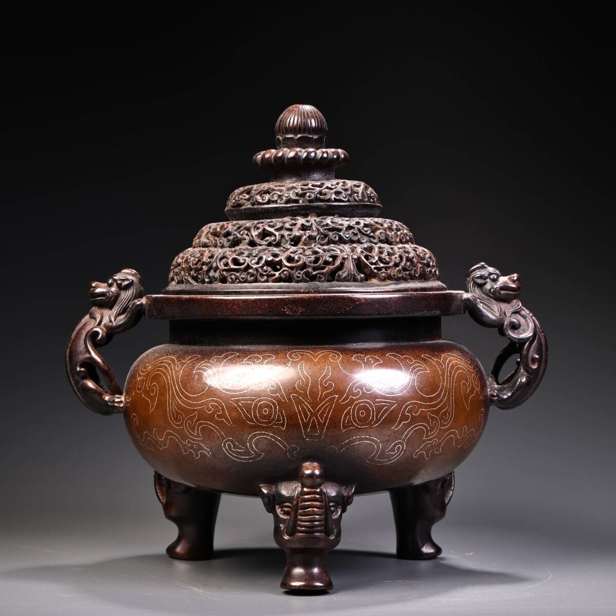 - 旧蔵 清 純銅 紫銅 モザイク銀糸 燻香炉 香道具 銅製品 極細工 中国古玩 骨董品 古美味 206-19