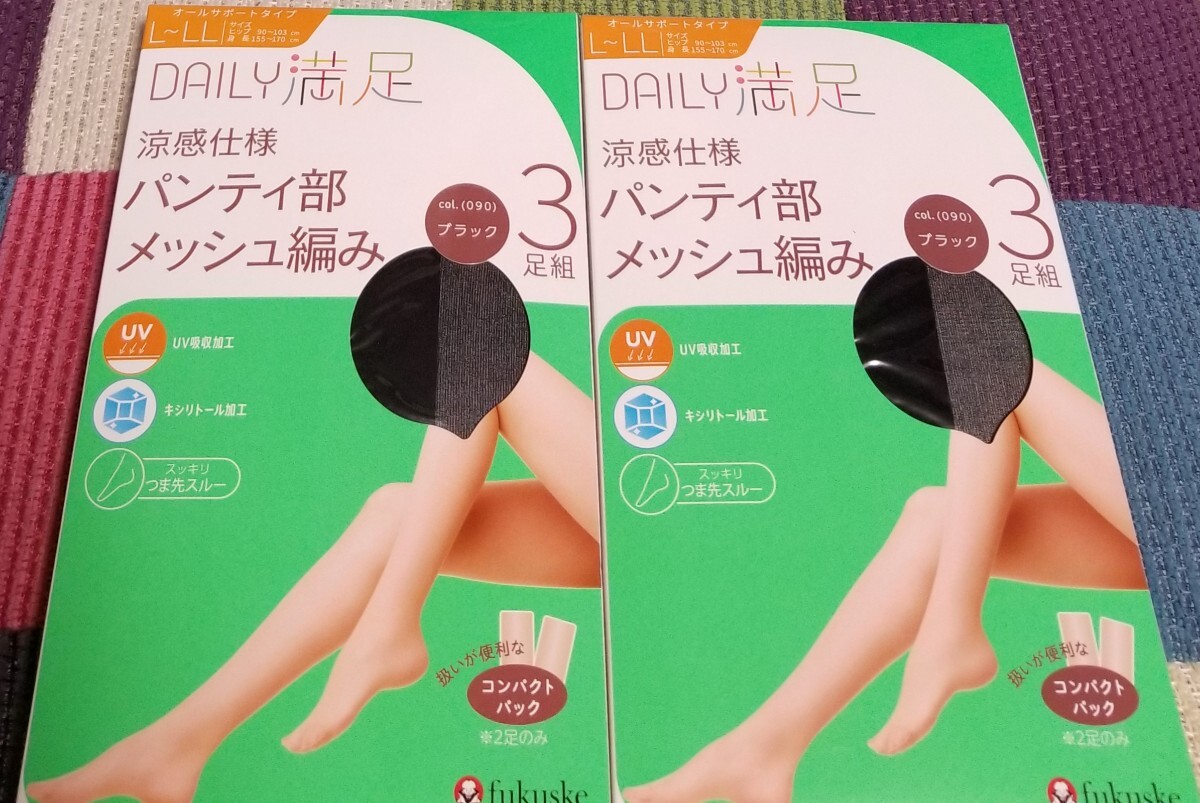 > 満足 L-LL 涼感仕様 UV ストッキング パンスト 6足セット 新品 福助 抗菌防臭加工 キシリトール加工 フクスケ ブラック