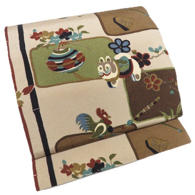 > 開き名古屋帯 なごや帯 中古 リサイクル 正絹 カジュアル 全通 縮緬地 動物文様 器物文様 亜麻色 多色 きもの北條 A1215-13