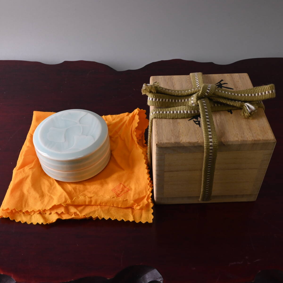 - K7603 【本物保証】人気作家 『藤井隆之』 香合「銀杏」 共布 青磁 茶道具 骨董 古玩