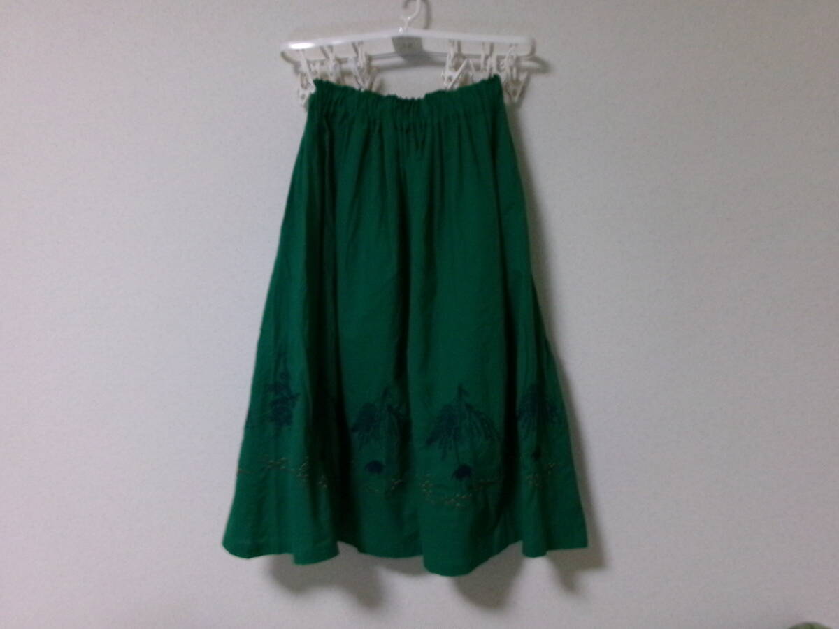 - ohanaオハナ☆キレイなグリーン濃緑のフレアロングスカート☆かわいい♪ネイビー紺の花束の刺繍入り☆ナチュラル&柔らか♪コットン素材☆F