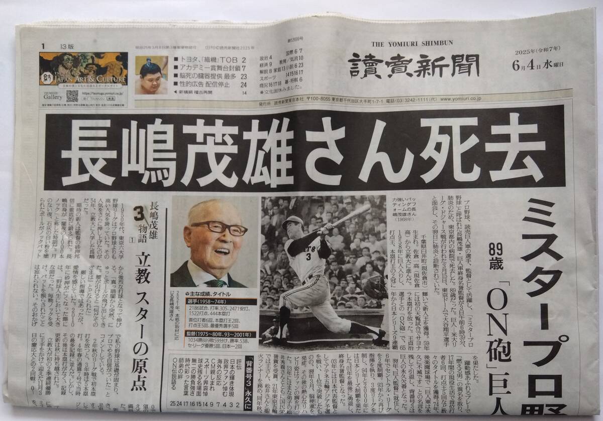 - 新聞 長嶋茂雄さん死去 2025.6.4 読売新聞 野球