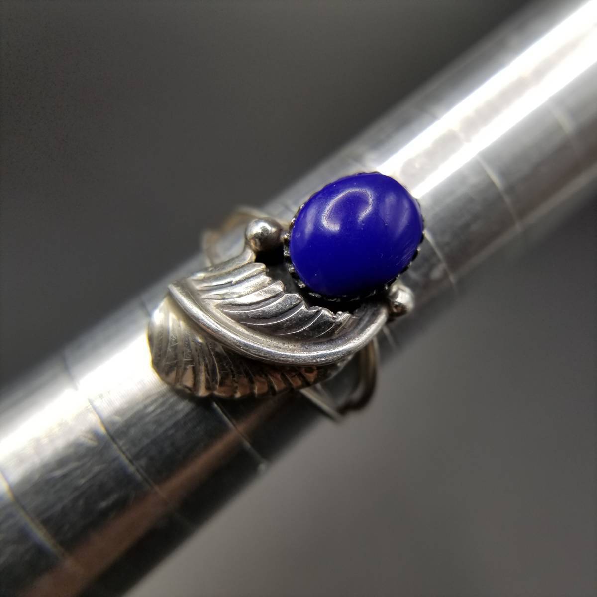 - ナバホ族 HR刻印 ラピスラズリ 羽根 フェザー スターリングシルバー ヴィンテージ リング 銀 指輪 ネイティブアメリカン 2g 8Y-K