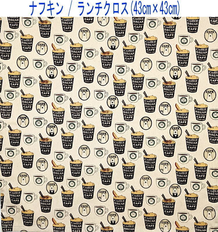 - ナフキン・ランチクロス(43cm×43cm)正方形【くまカフェ柄 生成り】ランチマット ランチョンマット 日本製 コーヒー 珈琲 白くま バリスタ