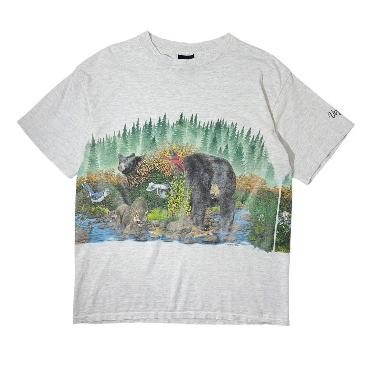 > L 90s USA製 HABITAT アニマル 両面プリント Tシャツ アート クマ 鳥 アライグマ シングルステッチ ヴィンテージ 古着 青杢 ホワイト