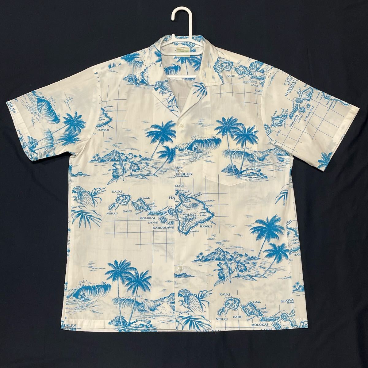 - 90s ハワイ製 jade Fashions アロハシャツ 柄合わせポケット 90年代 ポリコットン ホワイト×ブルー ハワイアンシャツ 総柄 早5594