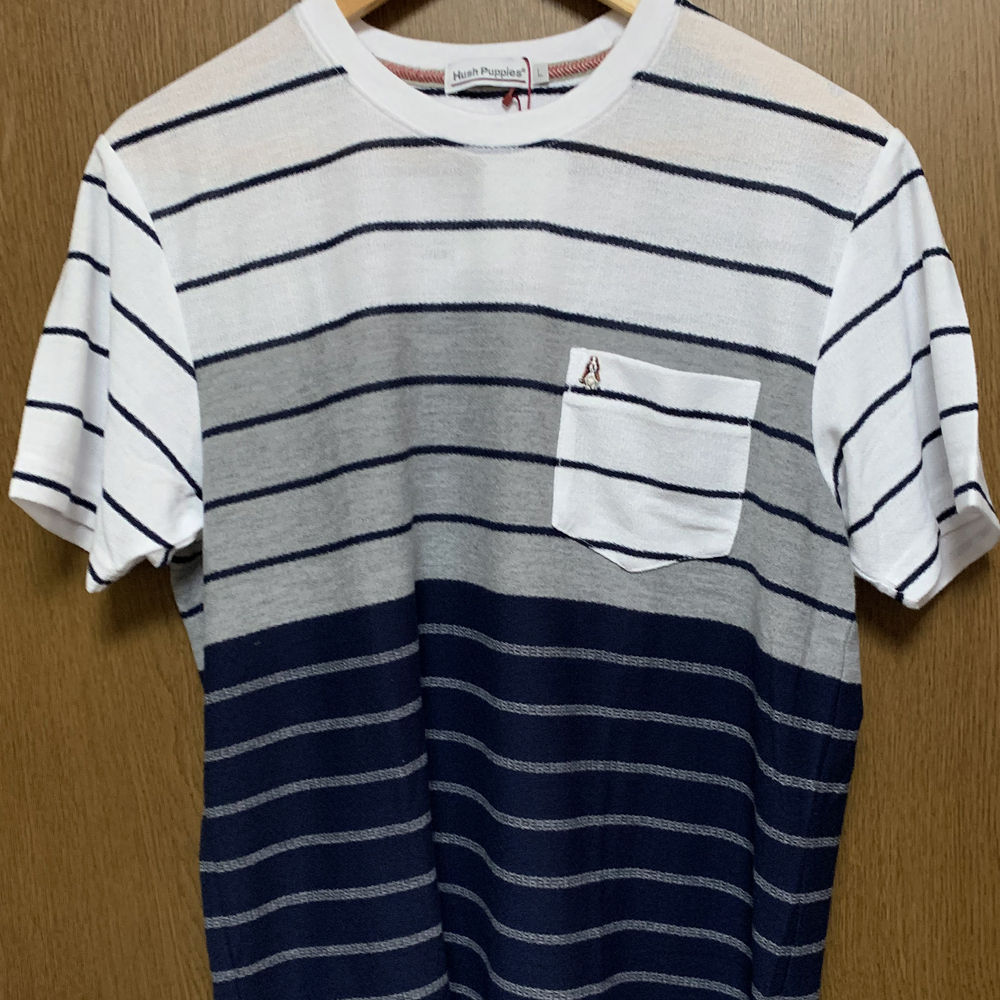 - L【Hush Puppies|半袖Tシャツ】ハッシュパピー 白×グレー×ネイビー系 シンプルロゴ ポケット付 未使用