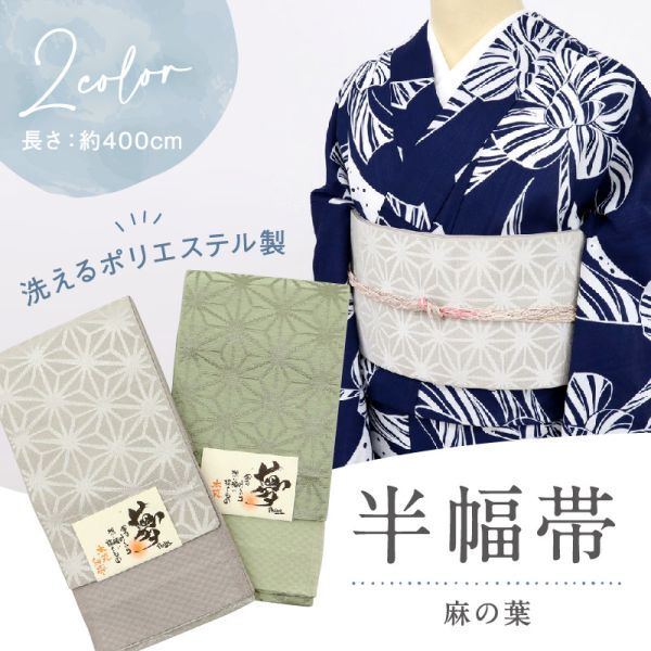 - 【半幅帯】 夢 麻の葉柄 『グリーンティー』 リバーシブル 小袋帯 おしゃれ 半巾帯 ポリエステル 長さ400cm 日本製
