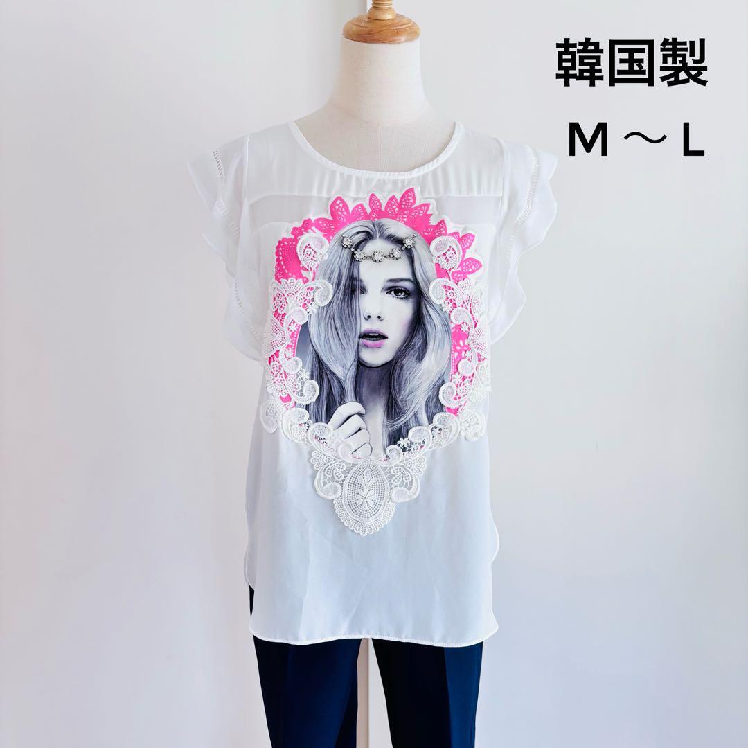 - 韓流ファッション 韓国製 グラフィック Tシャツ エンゼル ビジュー付き 可愛い フレンチスリーブ ブラウス M〜L