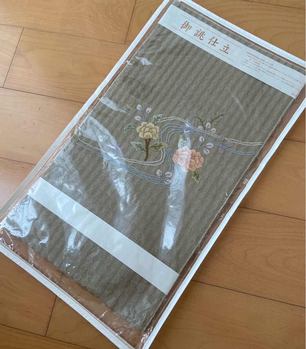 - 【新品未使用】夏帯 名古屋帯 化繊 刺繍 水流花文様 グレー系 帯丈408cm 涼やか 夏着物に