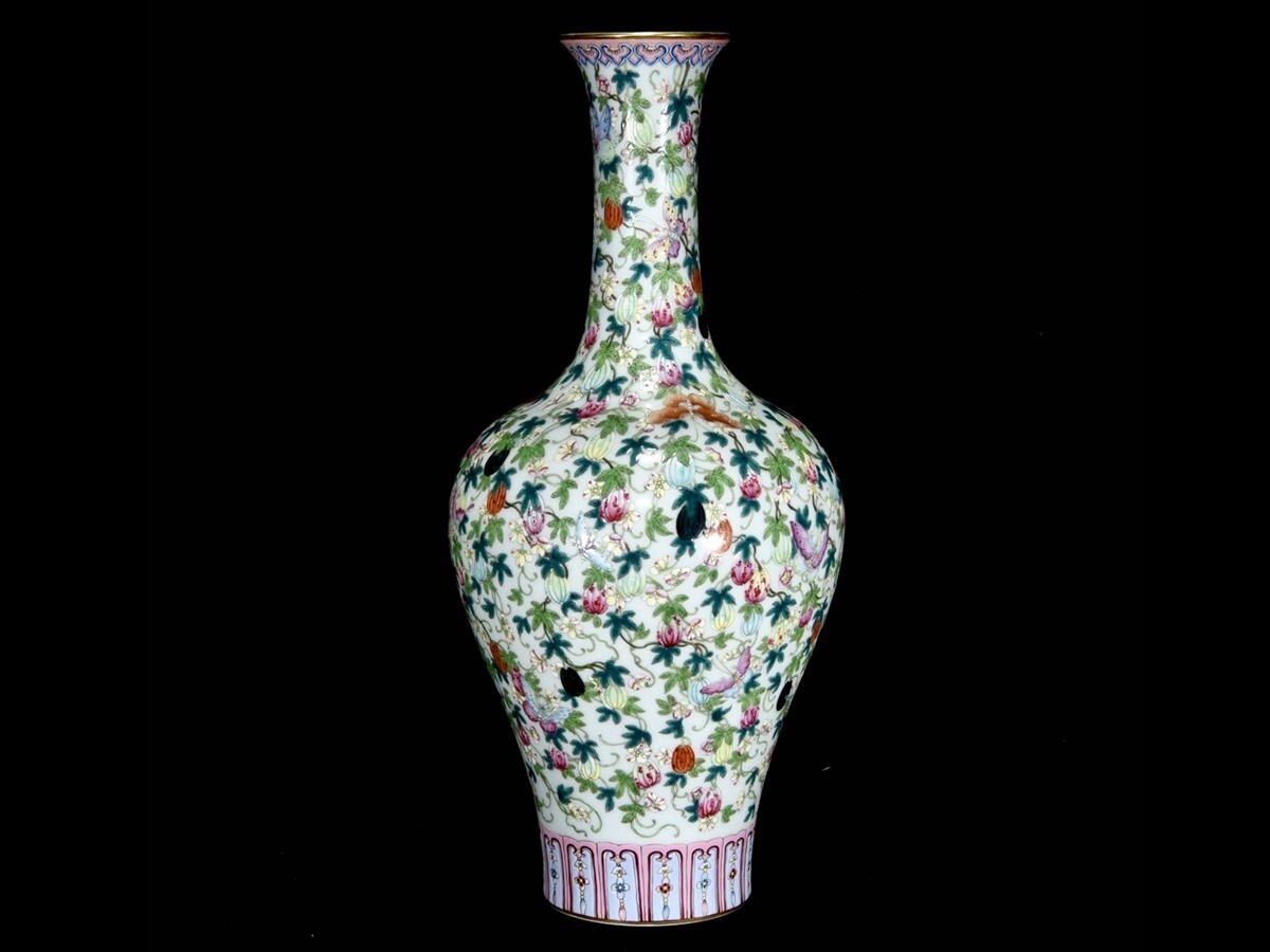 - 「清 乾隆年製 陶磁器 粉彩瓜果紋瓶」染付 置物 擺件 古賞物 中国古美術 旧蔵出