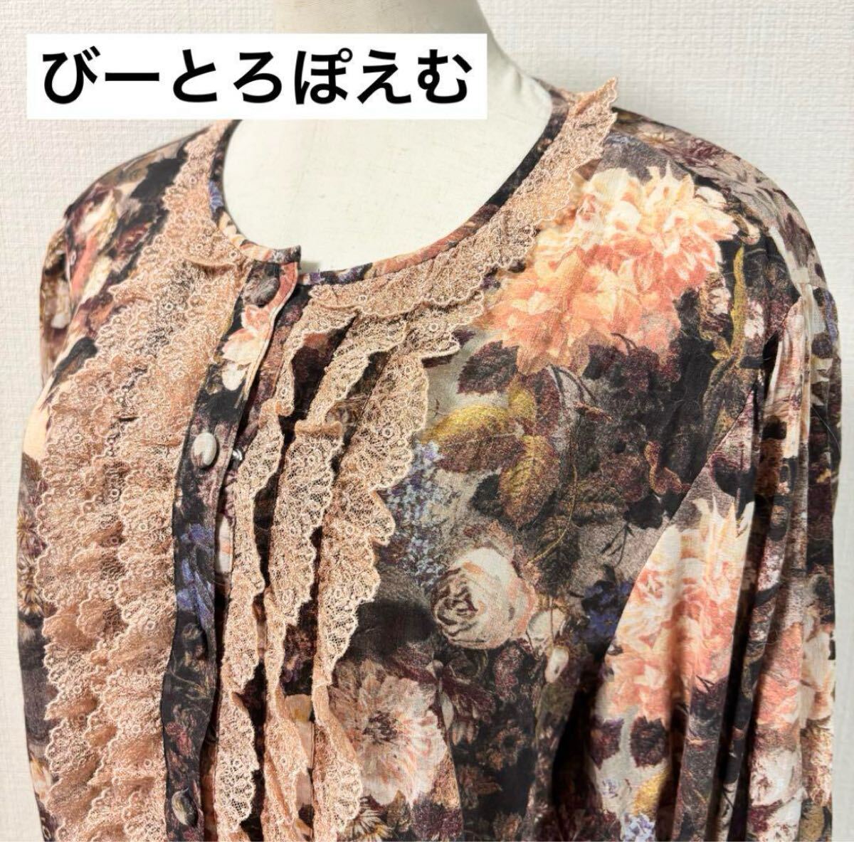 - 美品◇びーどろぽえむ◇ 絵画風フラワープリント フリルレース7分袖ブラウス◇