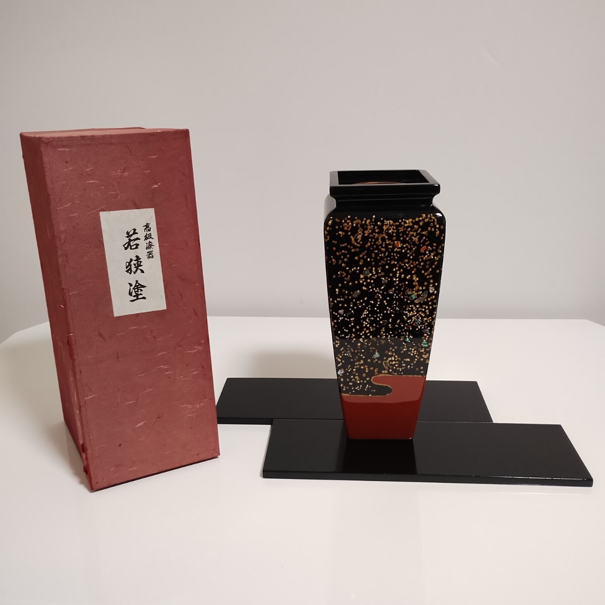 - 若狭塗 木製 螺鈿装飾 花器 花瓶 黒 花台付き