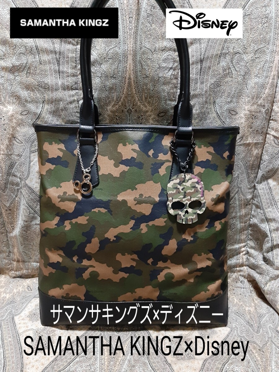 - サマンサキングズ×ディズニー SAMANTHA KINGZ×Disneyコラボレーション 本革コンビ/トートバッグ/L/迷彩/スカル×クリスタルチャーム付き