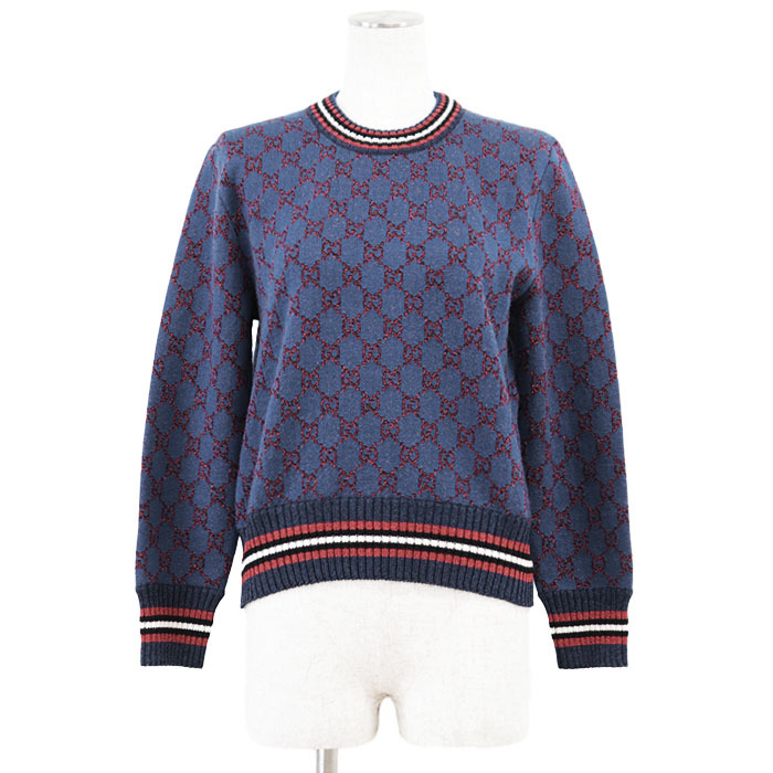 > 【極美品】GUCCI グッチ セーター ニット GG ロゴ モノグラム メタリック ラメ クルーネック ウール / カシミヤ レディース L 青 赤 伊製