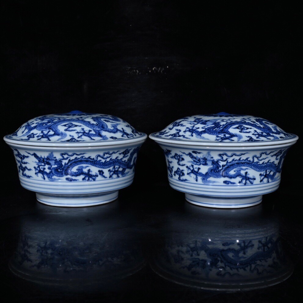 - 『館蔵珍品 明 宣德年製款 古陶瓷品 青花 龍紋 果盒一對 陶藝』稀少珍蔵品 古賞物 貴重物品 収蔵品 中国古美術 時代物 古董品