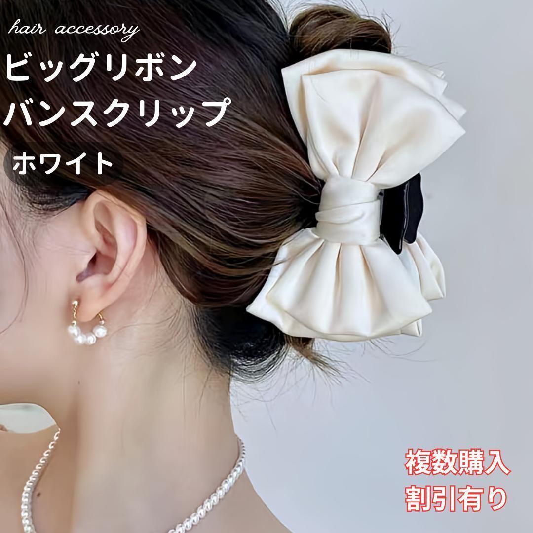 - 韓国風 ヘアアクセサリ リボン バンスクリップ ホワイト 大きめ 髪留め 髪飾り シュシュ ヘアクリップ バナナクリップ