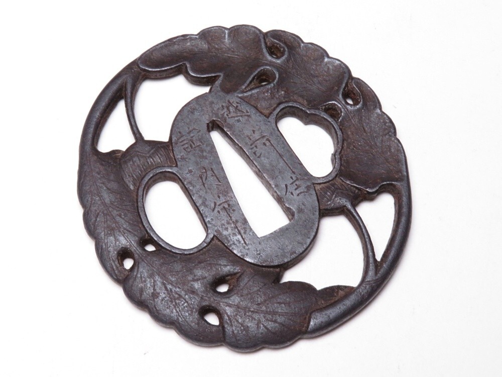 - 【10741】刀装具 (検/甲冑/刀/縁頭) 鉄地 在銘 透かし 鍔(初品・買取品)