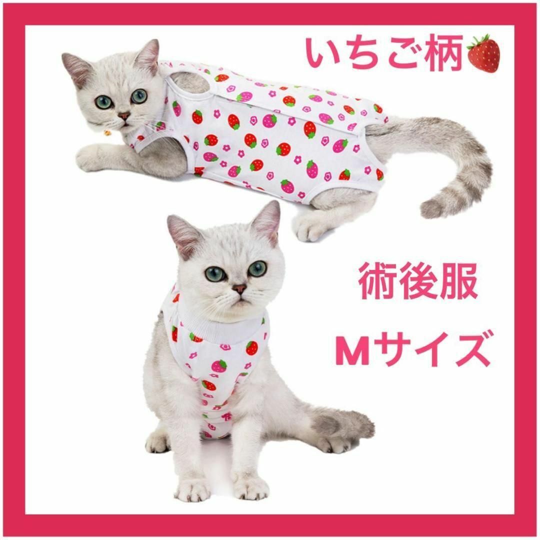 - 【ねこ用】【Mサイズ】術後服 保護服 いちご柄 引っ掻き防止 マジックテープ