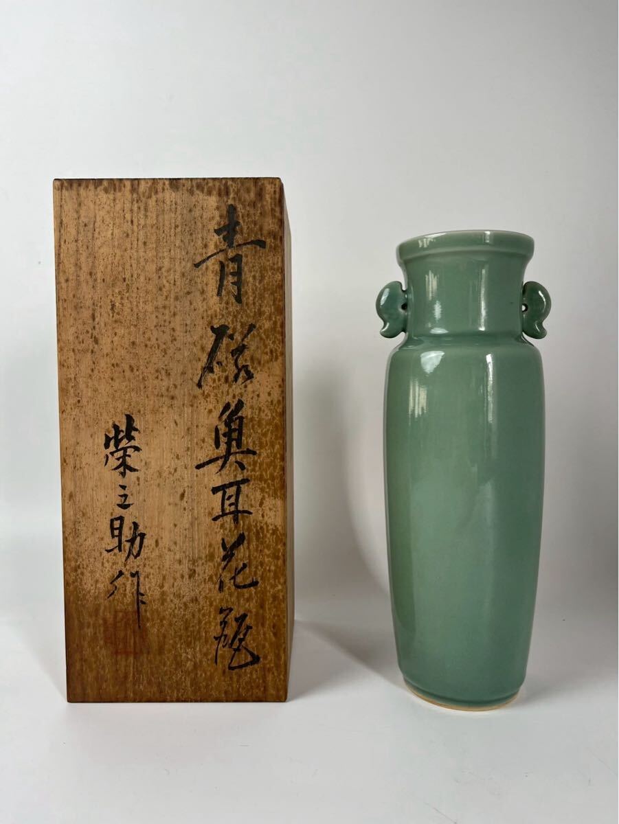 - 河合栄三助 造 青磁魚耳花瓶 共箱 青磁 骨董 栄三助 花瓶 茶道具 古美術 中国 花入 花生 耳付花入