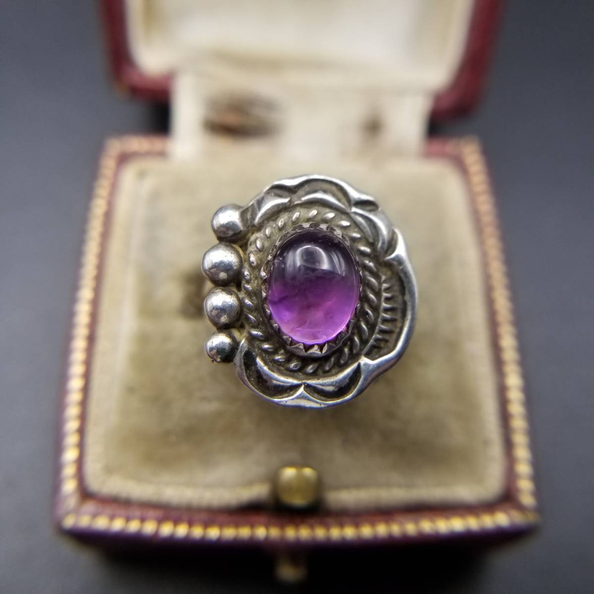 > ナバホ族 アメジスト カボション スタンプワーク 925 シルバー ヴィンテージ リング 5.5g 銀 指輪 NAVAJO インディアンジュエリー Y10-P