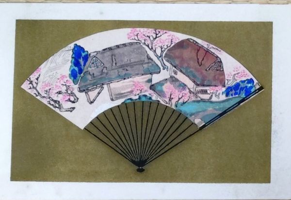- f25071016〇彩色木版画 ハガキサイズ 扇子 扇面 日本民家 グリーティングカード 錦絵 浮世絵 昭和年代〇和本古書古文書