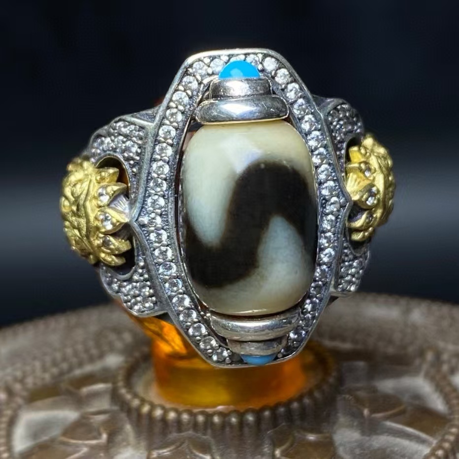 > 秘藏 清代 チベットの老天珠 高油老料 【八重歯の天珠古法包銀の指輪 】包漿渾厚 裝身具 骨董品 賞物 風水 開運 辟邪 吊墜 挂件 玉佩7.13