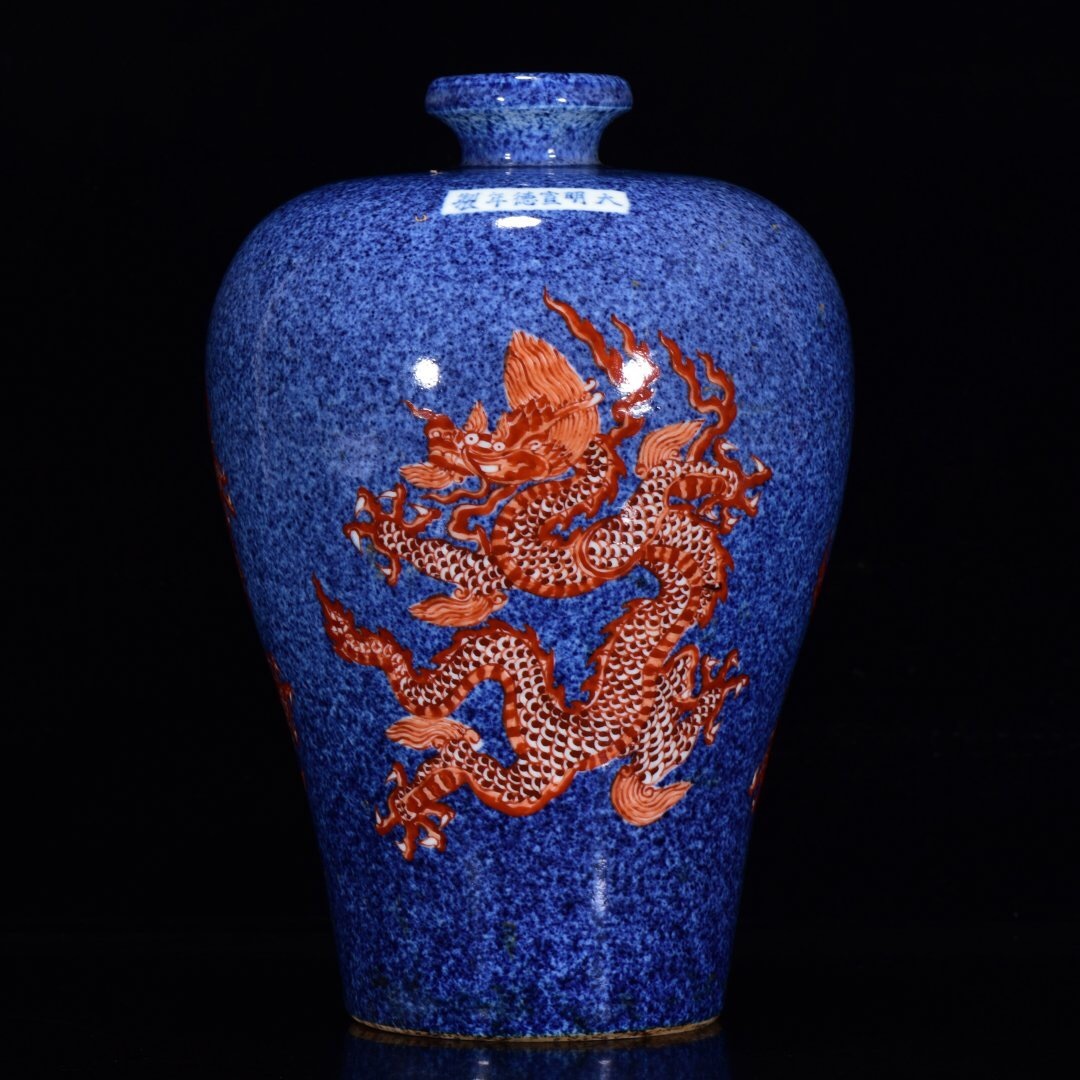 - ▽鴻▽ 明 宣德年製款 古陶瓷品 雪花藍 龍紋 梅瓶 陶藝 古賞物 古董品 時代物 稀少珍品 中国古玩 中国古美術