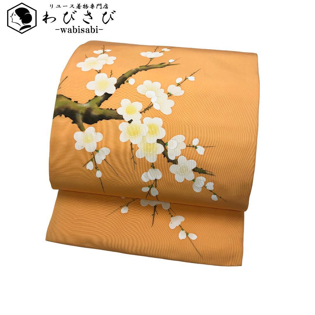 > 名古屋帯 塩瀬 手描き 梅の花模様 蜜柑色 O-5339 着物 きもの kimono 和服 和装 中古 リサイクル着物 【送料無料】