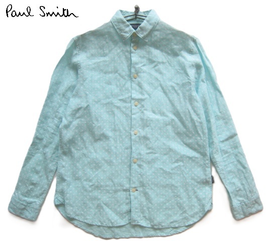 > 美品!!ポールスミス Paul Smit*美シルエット 麻100% ドット総柄プリント リネン隠しボタンダウンシャツ S ミント×白 COLLECTION