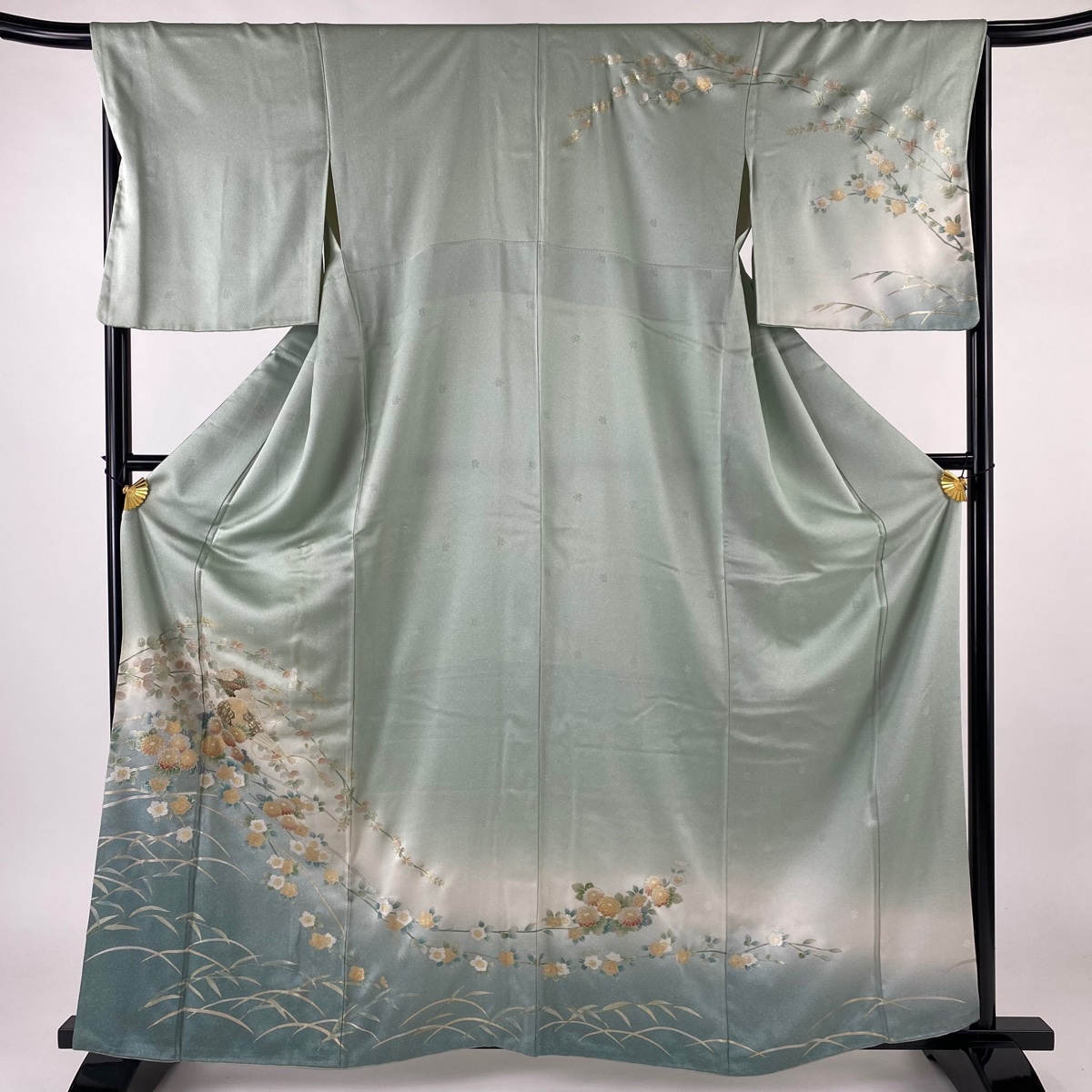 > 訪問着 身丈161.5cm 裄丈68cm L 袷 やまと 扇 菊 金銀彩 ぼかし 灰緑 正絹 秀品 【中古】