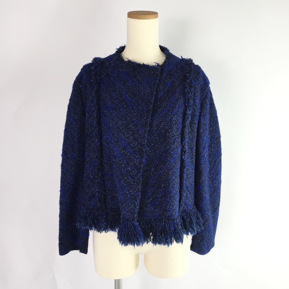 コメント:上品なツイードジャケット。ノーカラーデザインにフリンジがポイント。フォーマルはもちろんカジュアルスタイルにも合わせやすいアイテムです。フロントはホックなどの留め具がないデザインです。ジャケットのみの販売となります。同シリーズのセットアップにもなるスカートも販売しています。