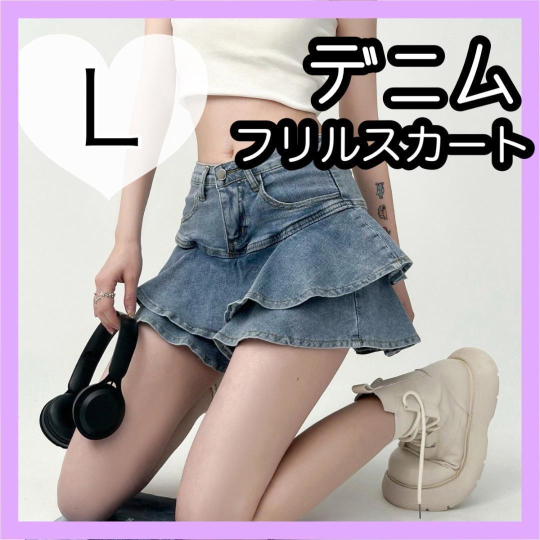 - ミニスカート デニム フリル Lサイズ インナーパンツ 韓国 ストレッチ
