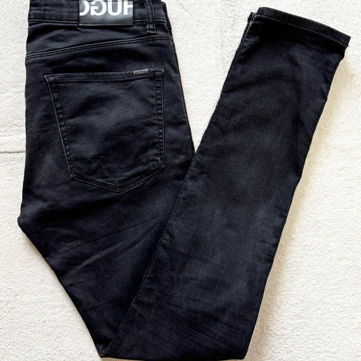 > 希少L◎ヒューゴボス HUGO BOSS ブラックデニム スキニー テーパード ジーンズ パンツ ボトムス レザーパッチ ロゴボタン ストレッチ 黒 32