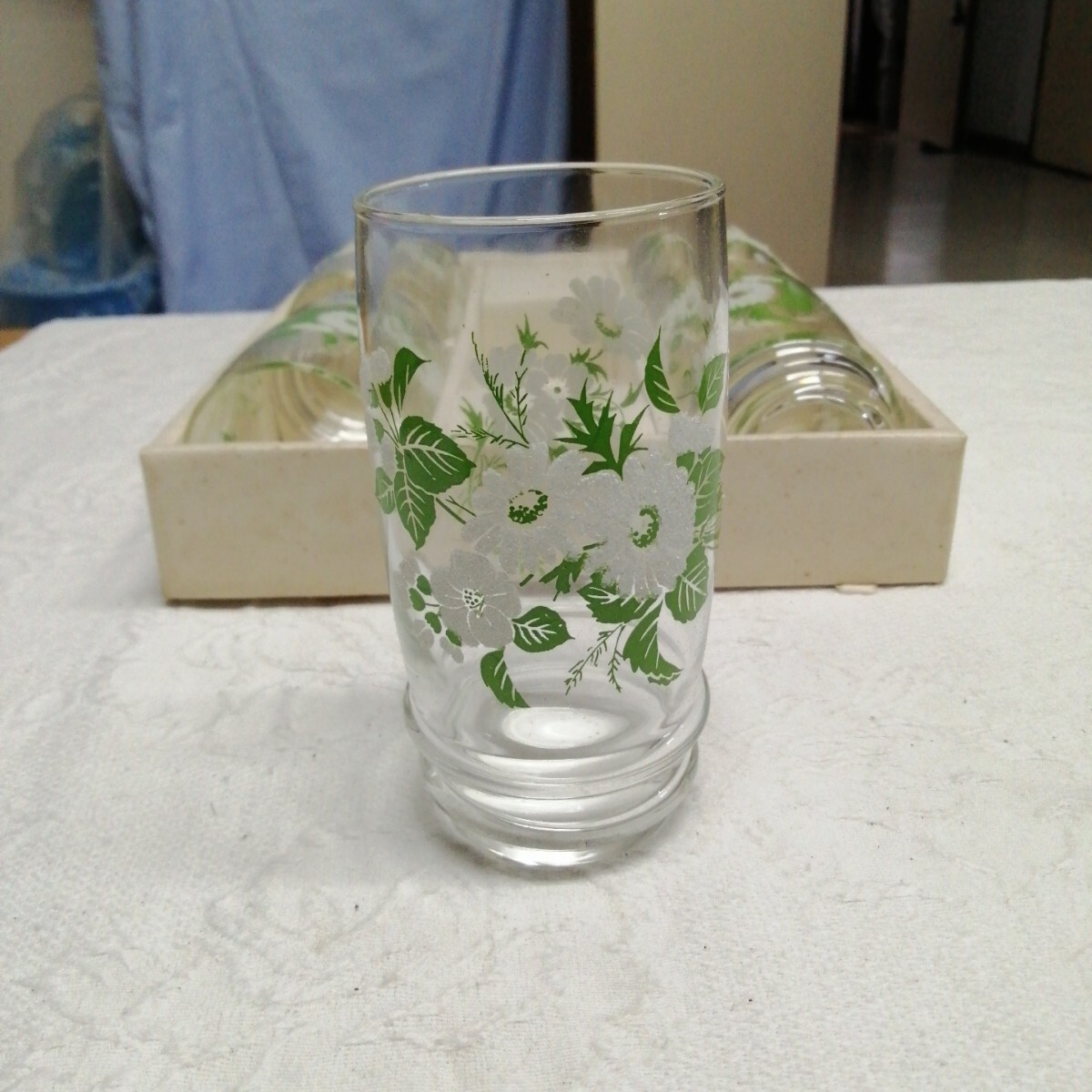 > 昭和レトロ ガラスコップ グラス 硝子 緑 グリーン 花柄模様 冷茶 タンブラー アンティーク(約高さ12cm)