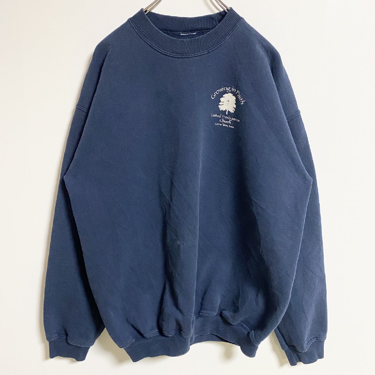 - 古着 used 長袖ワンポイントプリントスウェット トレーナー クルーネック ネイビー レトロ デザイン 秋冬服