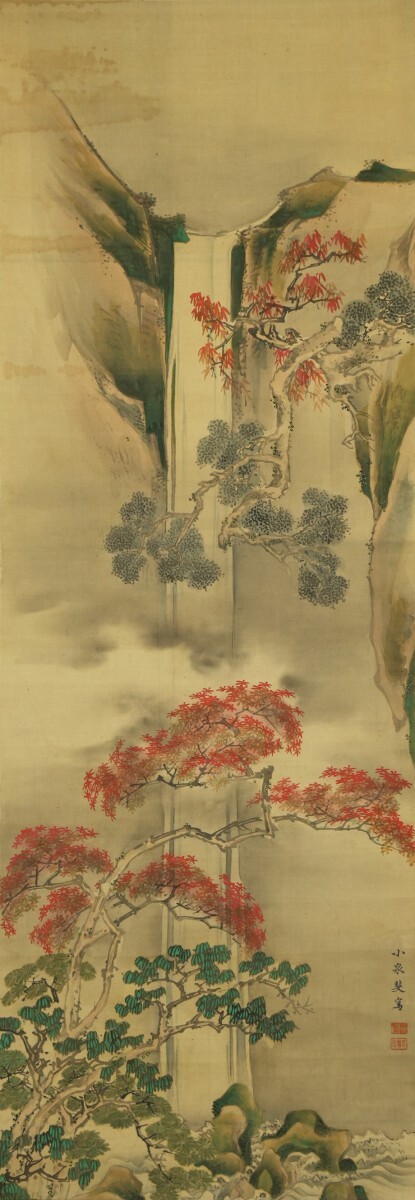 - 【真作】掛軸「小泉檀山 青紅楓瀑布図」江戸後期 画家 温泉神社大宮司 木村一正子 島崎雲圃・立原翠軒門下 鮎図名手 立原杏所師 絵画