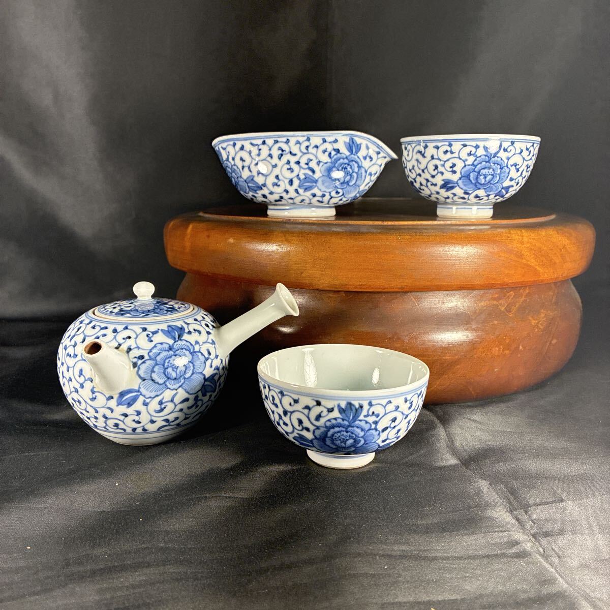 - 中国美術 青華 茶器セット 急須 茶器 湯呑み 湯冷し 茶器木製蓋ケース 煎茶道具 セット 清中期