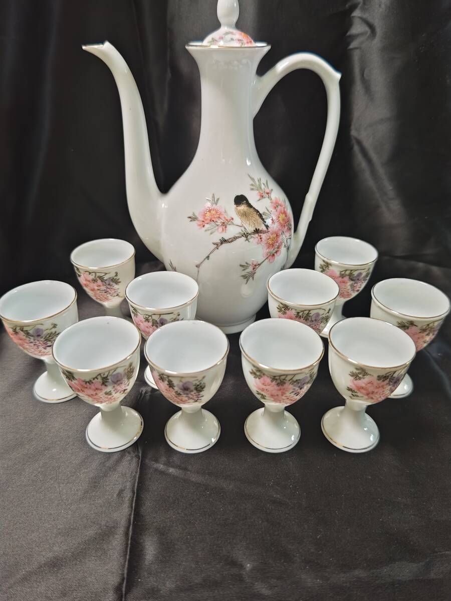 > 中国 景徳鎮 酒器セット 11P 「梅にウグイス」ハンドペイント 手彩 酒杯