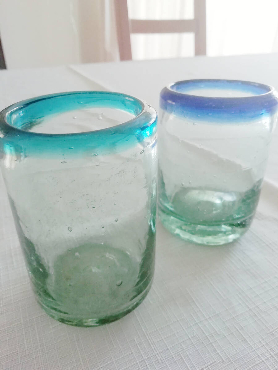 - 2個セット 古いものです。ガラス コップ 青 水色 レトロ アンティーク 木箱入り