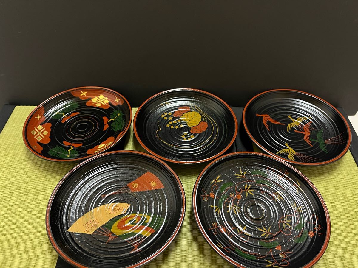 - 【未使用保管品】山中漆器 銘々皿 図変わり 絵変わり 5客 天然木 菓子器 茶道具 共箱