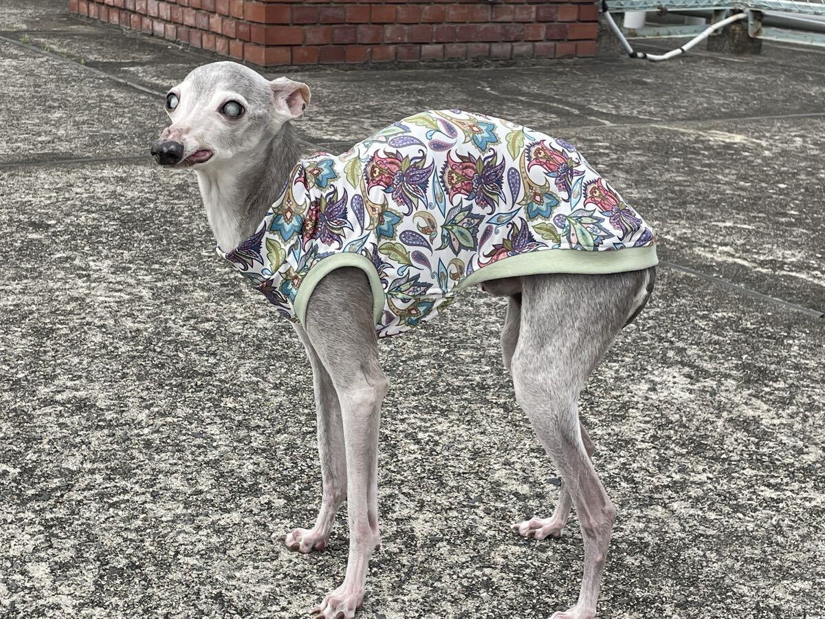 > 棚卸SALE サンプル*接触冷感・UV加工のクールニット エスニック柄*イタグレ用 胴44/首26/着丈40(背中実寸37位の子向け)