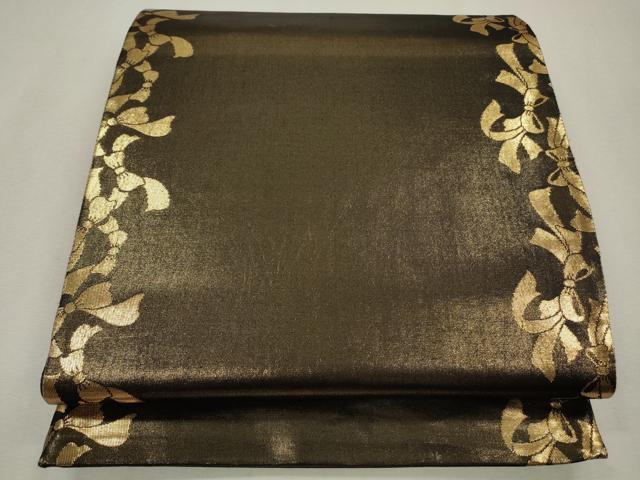 > 平和屋着物◎全通柄袋帯 リボン 黒地 金糸 正絹 逸品 CAAV0118qe